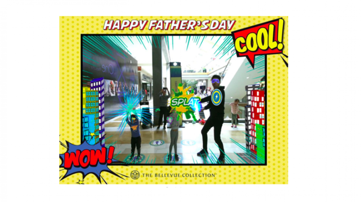 What could be more fun than becoming a Super Hero for a day while making a digital Father’s Day card with The Bellevue Collection’s Augmented Reality (AR) photo opportunity. In collaboration with Seattle based company, Pixelfire, this AR experience offers a fun Father’s Day activation. The Bellevue Collection wanted to create an ongoing space for a very unique interaction with technology and looked to the innovative local partner, Pixelfire to make it happen. Since the kick-off of this AR experience with a first-of-its-kind Snowflake Lane AR in December, thousands have made downloadable free digital cards as part of the Collection Plays low tech and high tech complimentary game area. The AR experience is a Kinect based photo opportunity that superimposes super hero costume elements on guests including masks, chest emblems and action word graphic clouds. Hand movements activate additional motion graphics giving each user a unique “super power.” After 60 seconds of fun, a picture is taken automatically and uploaded with a custom digital frame to The Bellevue Collection’s website. The photos can be downloaded for free and shared on social media by visiting Collectionplays.com.