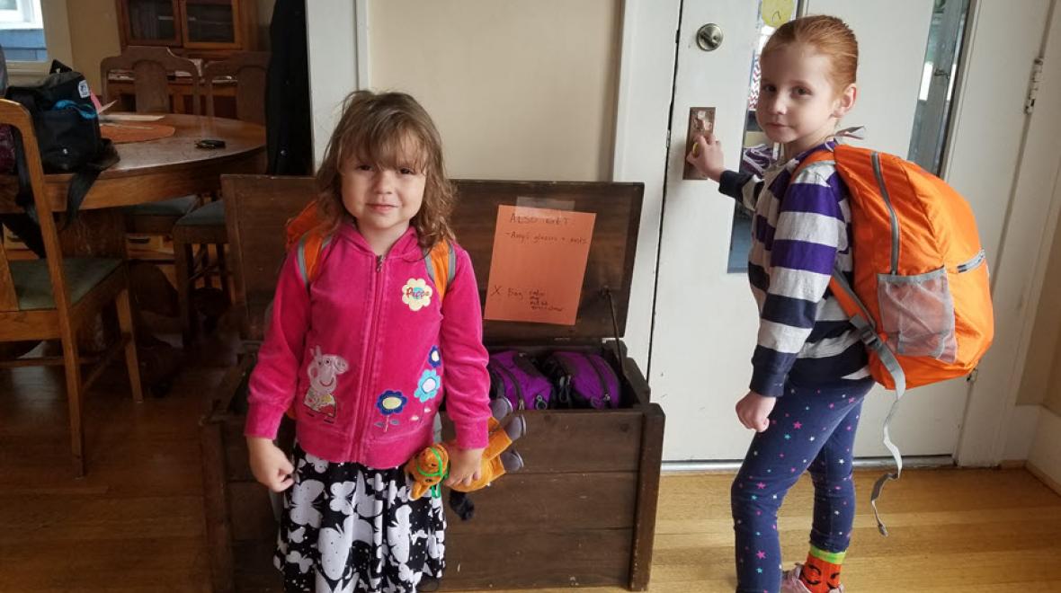 Katalina and Benjamin Freeman pictured with their emergency “bug-out bag” backpacks, packed with evacuation essentials. Kids’ bags should also include: ID, contact information and small games or a comfort item, such as Katalina's stuffed toy. Bags should be stored right by the door for quick access in the event an evacuation is necessary. Photo credit: Brianna Enriquez, M.D.