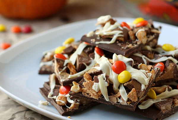 Use up all of those extra Halloween sweets by whipping up a batch of festive candy bark. Featured on Completely Delicious, this snacky, fall treat idea is incredibly easy to make and a favorite for many. Simply break up the candy pieces of your choice (M&Ms, peanut butter cups, Butterfingers, etc.), top them on a sheet of melted chocolate chips and let the bark harden in the fridge for an hour. See the rest of the post for more tips and additional neat ideas for using up leftover Halloween treats.