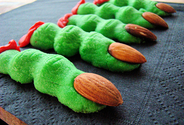 Sprinkle a little black magic into this year’s Halloween treats with this fun recipe for spooky witch finger cookies featured on La Petite Brioche. Made with shortbread that’s been dyed with bright green food coloring and manipulated to look like bony fingers, these cookies are decked out with “decaying” almond nails and oozy white chocolate “blood.” See the full post for the tutorial and recipe.