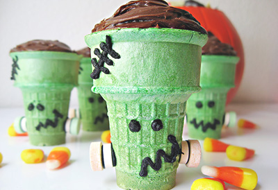 To make your own pint-sized Franken-cakes, purchase store-bought colored ice cream cones, cupcake mix, frosting, Sweetart and Smarties candies, and some black icing for Frankenstein's frighteningly fun face.