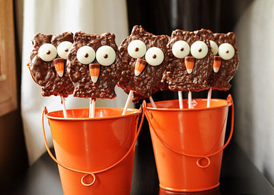 At first glance, we thought that these cute little guys just had to be made from repurposed Crunch candy bars, but that's not the case. Mama Jill simply used leftover Rice Krispie treats and melted chocolate wafers to get the same effect! For the owls' eyes, Jill used white chocolate melting wafers, and completed the entire look with candy corn beaks. Much like the spider pops, these fall baby birdies would also make for excellent take-home goody bag booty!