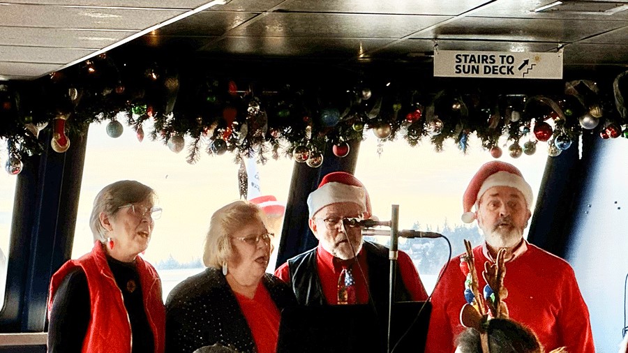 Another festive component of the Argosy Christmas cruise is the 20-minute choir performance. The ship stops halfway through its route and broadcasts the performance to an audience onshore. Our ship stopped near Pritchard Island Beach, where people gathered around a bonfire during the performance. In the Mix, a local quartet, sang a few Christmas carols and invited everyone to join in for “White Christmas” at the end.