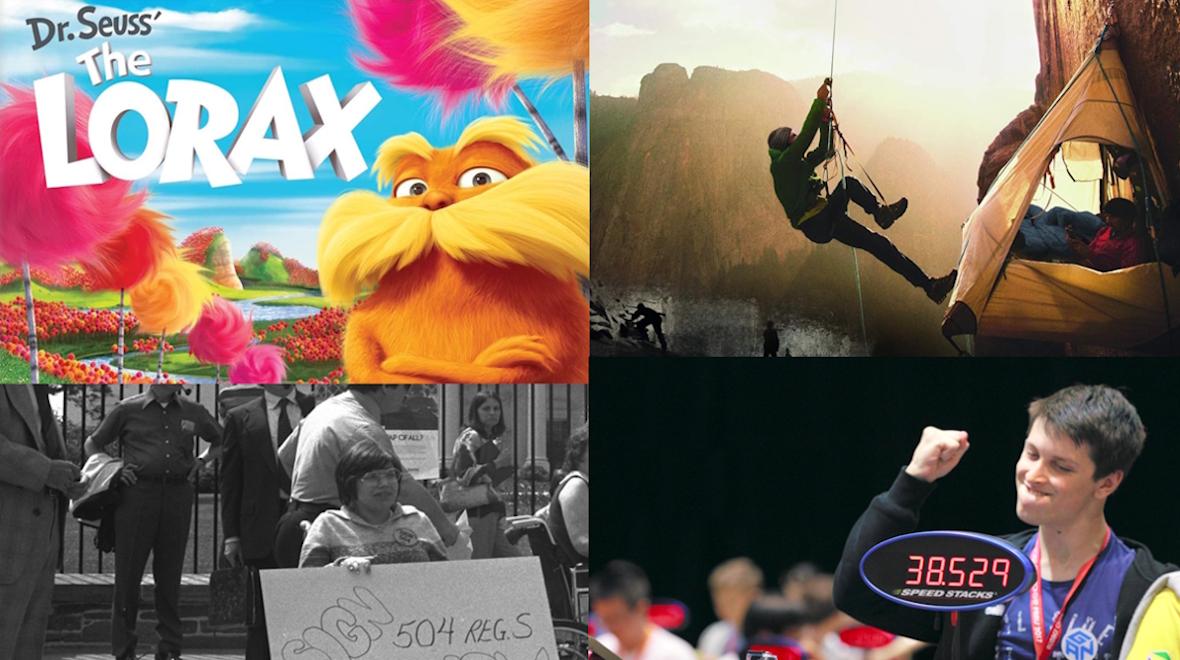Top: “The Lorax” and “The Dawn Wall” images courtesy of Amazon. Bottom: “Crip Camp” and “The Speed Cubers” images courtesy of Netflix.