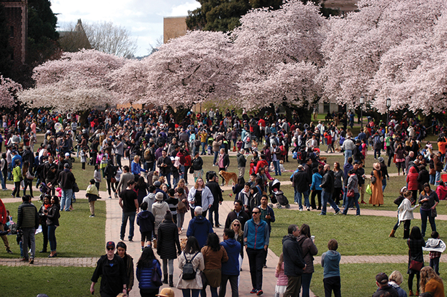 The University of Washington’s Quad is a popular destination for a reason. It’s the most iconic place in town to peep those cherry blossoms. For the most up-to-date info on the blooms, follow the UW cherry blossoms on Instagram or Twitter. When those 29 Yoshino cherry trees are in bloom, that patch of grass is covered with people slinging their kids and cameras.