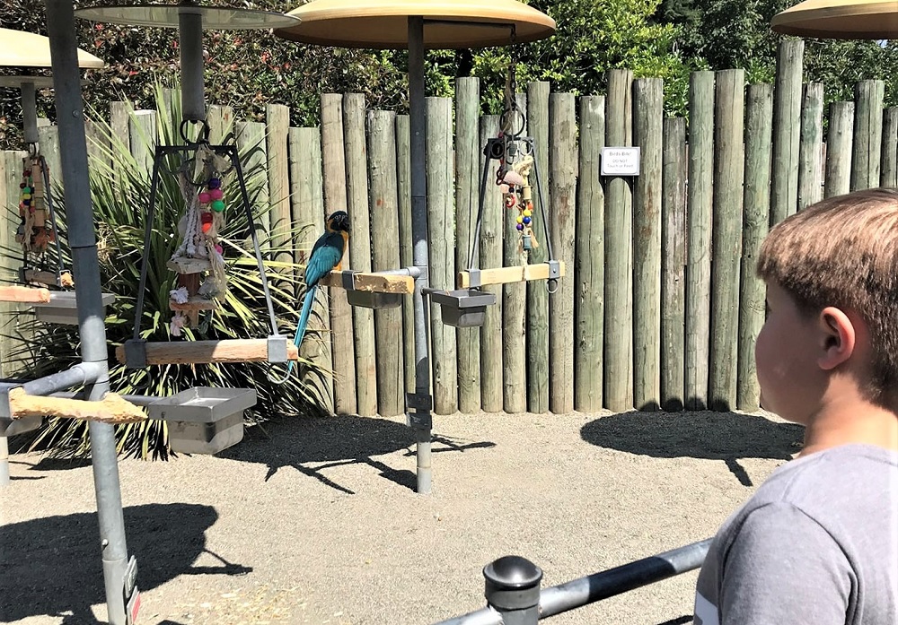 A surprising favorite for us was the Macaw Museum. Several of the colorful and sometimes noisy birds were allowed to roost on small perches in the open, allowing visitors up close and personal views of their beautiful plumes. Some smaller macaws and cockatoos are still housed in caged enclosures. The reason, explained Hendricks, is to keep them safe from predatory birds. All birds are brought inside when the zoo closes.