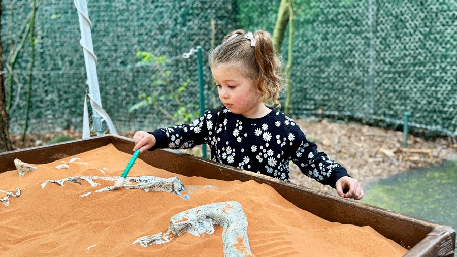 Halfway down the path, we found two fossil digging stations, both filled with sand and dinosaur bones. One station was under a tent, with dry sand that we could easily brush away to uncover the fossils. The other was out in the open, and after a morning of rain, held wet sand that packed around the bones. It made digging with the brushes more difficult — but perhaps more realistic — for us as we pretended to be paleontologists.