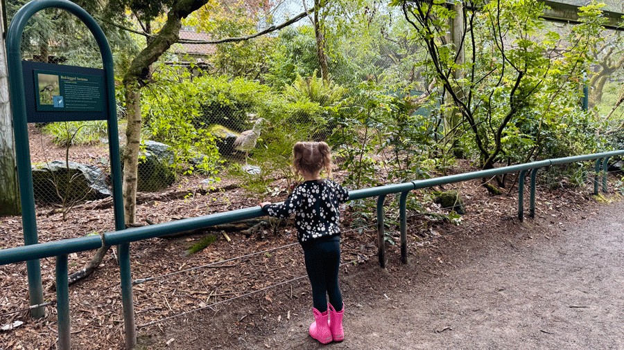 Our first stop outside of the dinosaur exhibit: the flamingoes, dipping their beaks in the water and showing off their bright pink feathers. Up next was a charming red panda, high in the trees. My daughter delighted in seeing her favorite stuffed animal (from a prior zoo gift shop purchase) in real life, and we watched as it climbed across a branch. Then it was time for birds aplenty, from red-legged seriema to white-naped cranes.