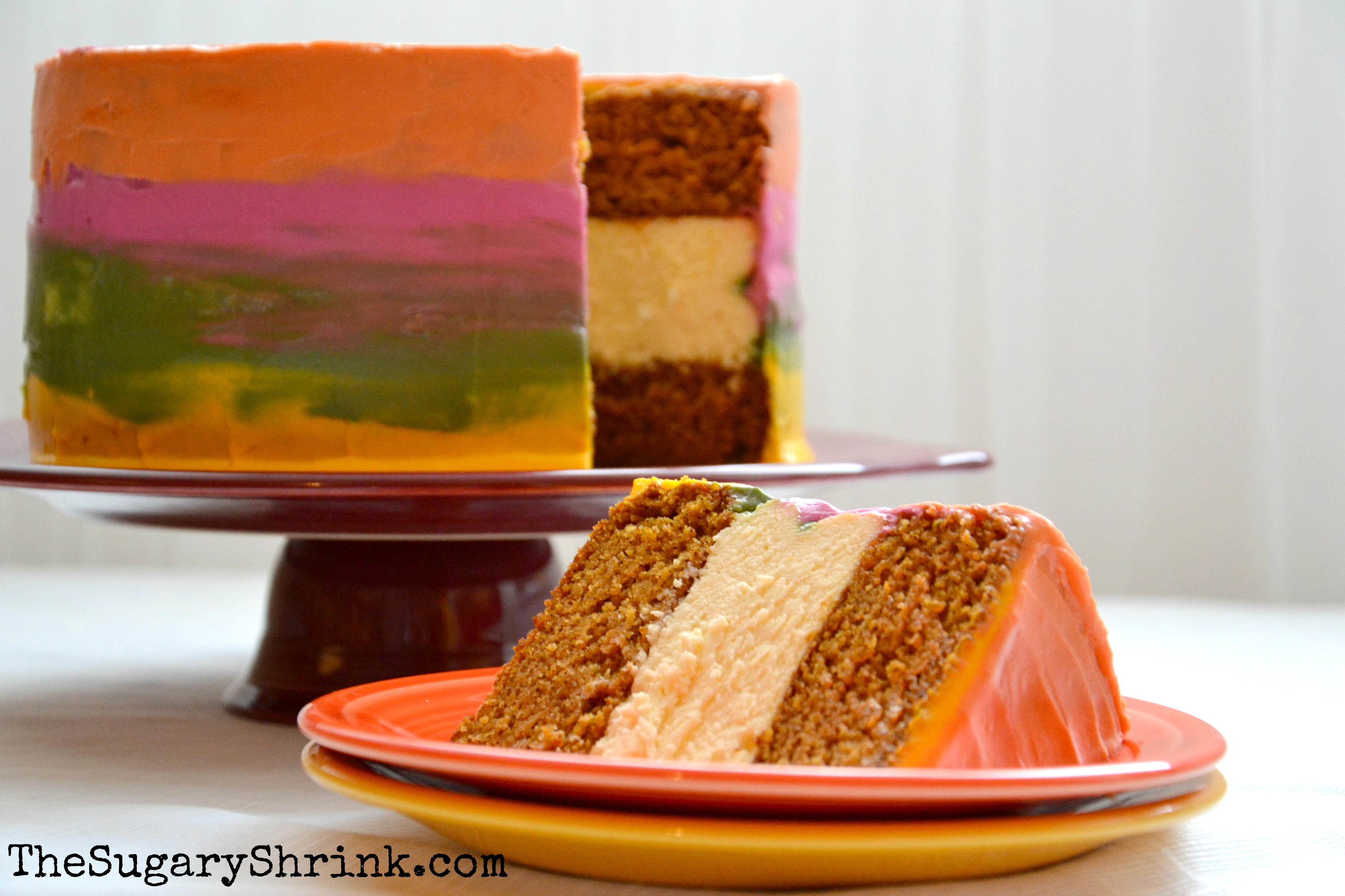 This pumpkin cake with a cheesecake layer and a frosting of tinted cream cheese buttercream tasted as heavenly as it sounds (if you like pumpkin and cheesecake). The texture of the pumpkin cake paired brilliantly with the cheesecake. Consider a cake like this as an alternative to pie or an addition to your Thanksgiving dessert options. Can you already hear, "Oh, I can't have a whole slice, just give me a sliver... of everything."