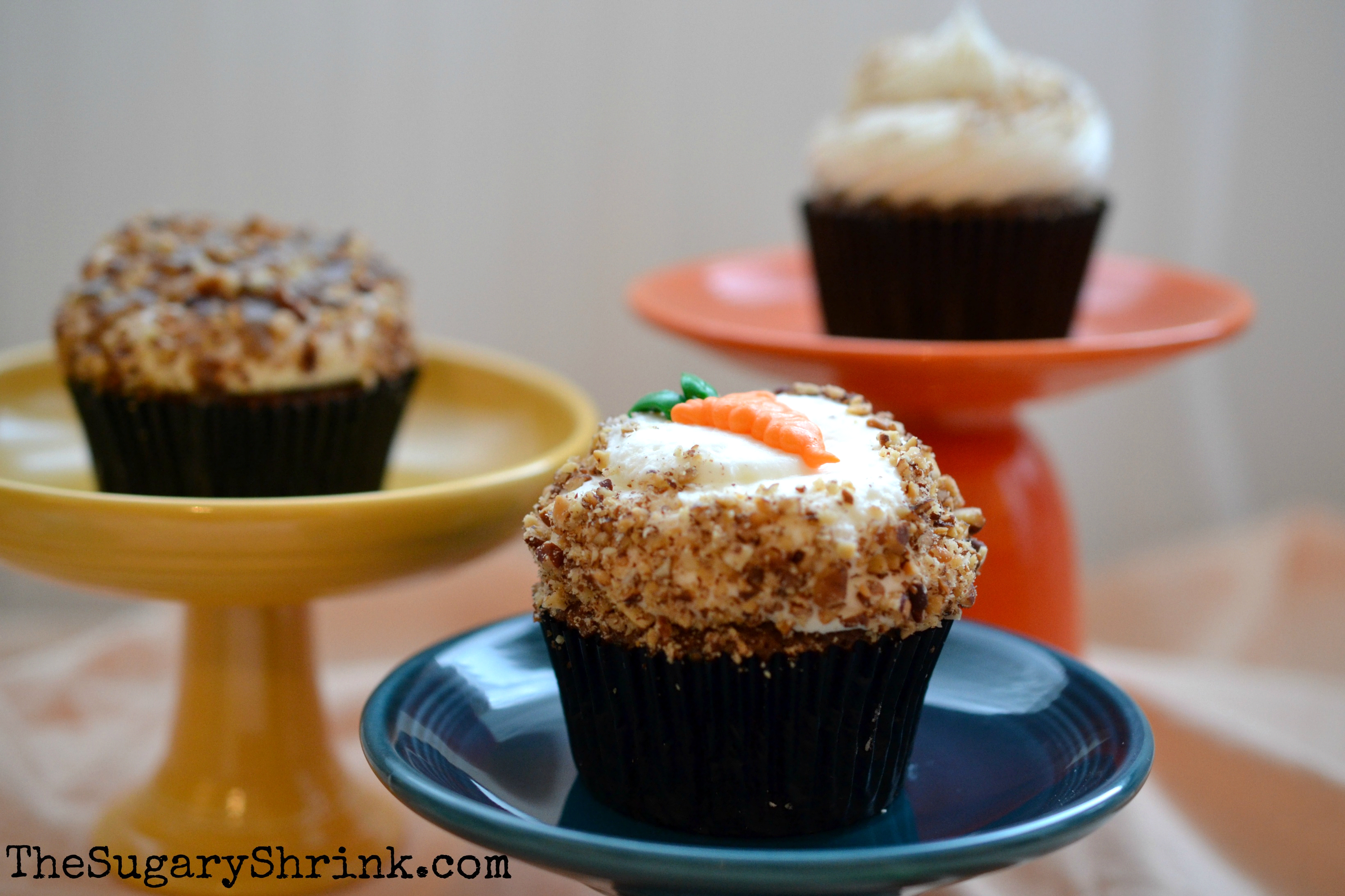 This is the same scrumptious carrot cake frosted with cream cheese buttercream, garnished with toasted walnuts and a little piped on carrot. Cupcake design offers limitless possibilities.