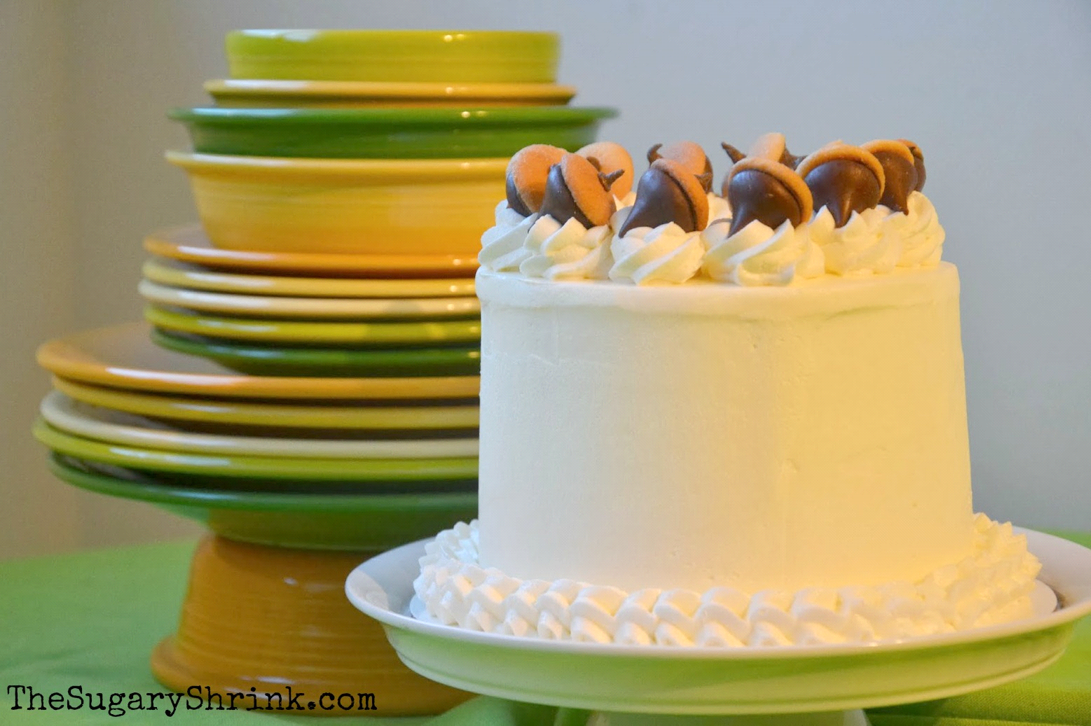The simplicity of this apple cake with vanilla buttercream is perfect this time of year and the "acorns" help elevate this little beauty to the dessert table.