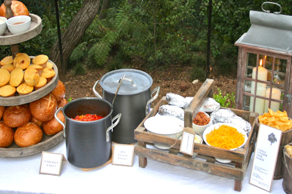 When finger foods aren’t enough to satisfy the big eaters, set up a hearty baked potato bar like this stunner by Bloom Designs. Put out the typical sour cream, butter and cheese toppers, but throw in some curveballs, too. Taco toppings? Greek style? Who will make the most interesting combo?