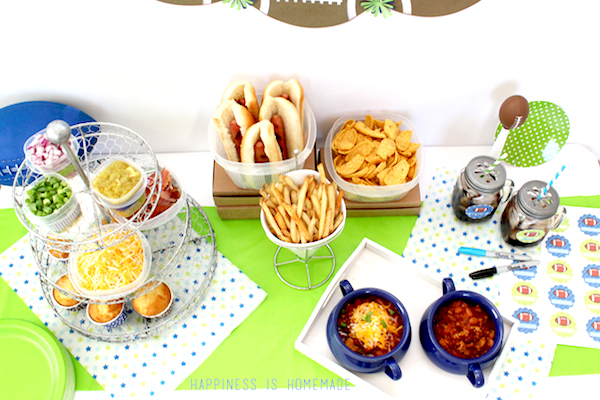 Happiness is Homemade pulls together a nice chili bar, equipped with a tower of toppings, cornbread muffins and hot dogs. Head over to the full post for printable football drink labels and a stockpot turkey chili recipe perfect for game day.