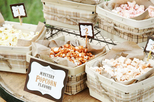 Pen N’ Paper Flowers charmed our socks off with this salty and sweet popcorn bar idea. The popular snack gets a delicate (and mysterious…) spin when kernels are covered in tasty toppings like caramel, cinnamon and chili-lime, or partnered with Reese’s Pieces.