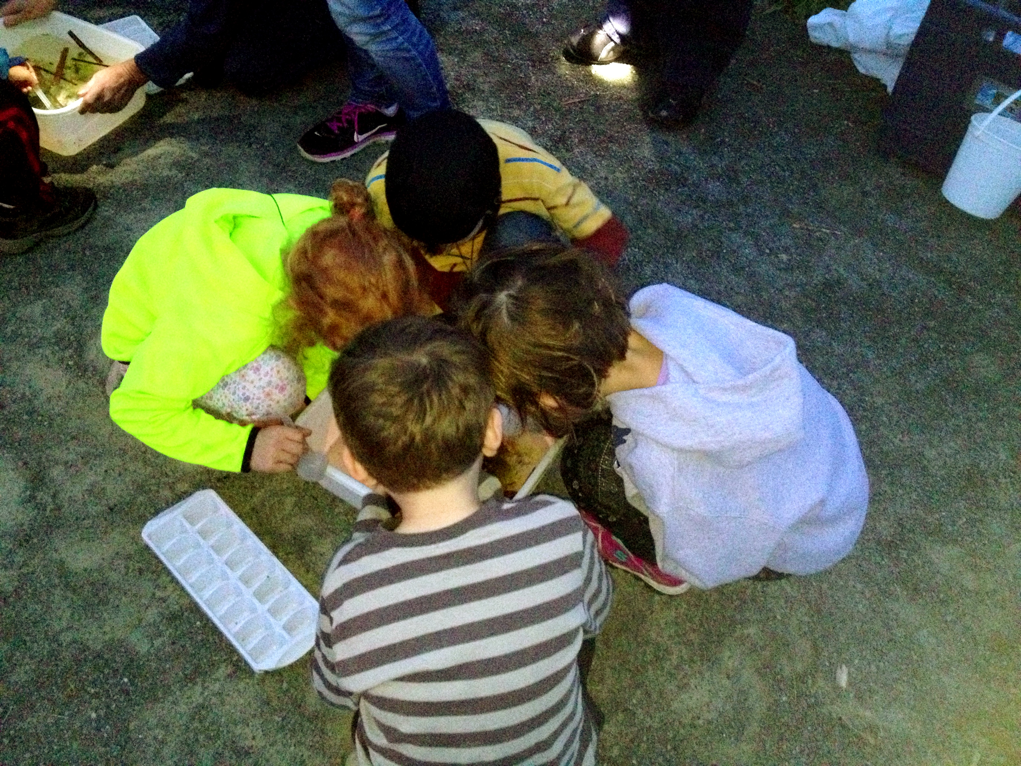 After that lead-up, kids were excited to walk in small groups down a narrow path to see a beaver dam, a 6-foot-tall masterwork that we viewed from the top. A final highlight of the evening was a chance to peruse pond samples, teeming with tadpoles, mayflies and damselfly larvae. Microscopic magic.