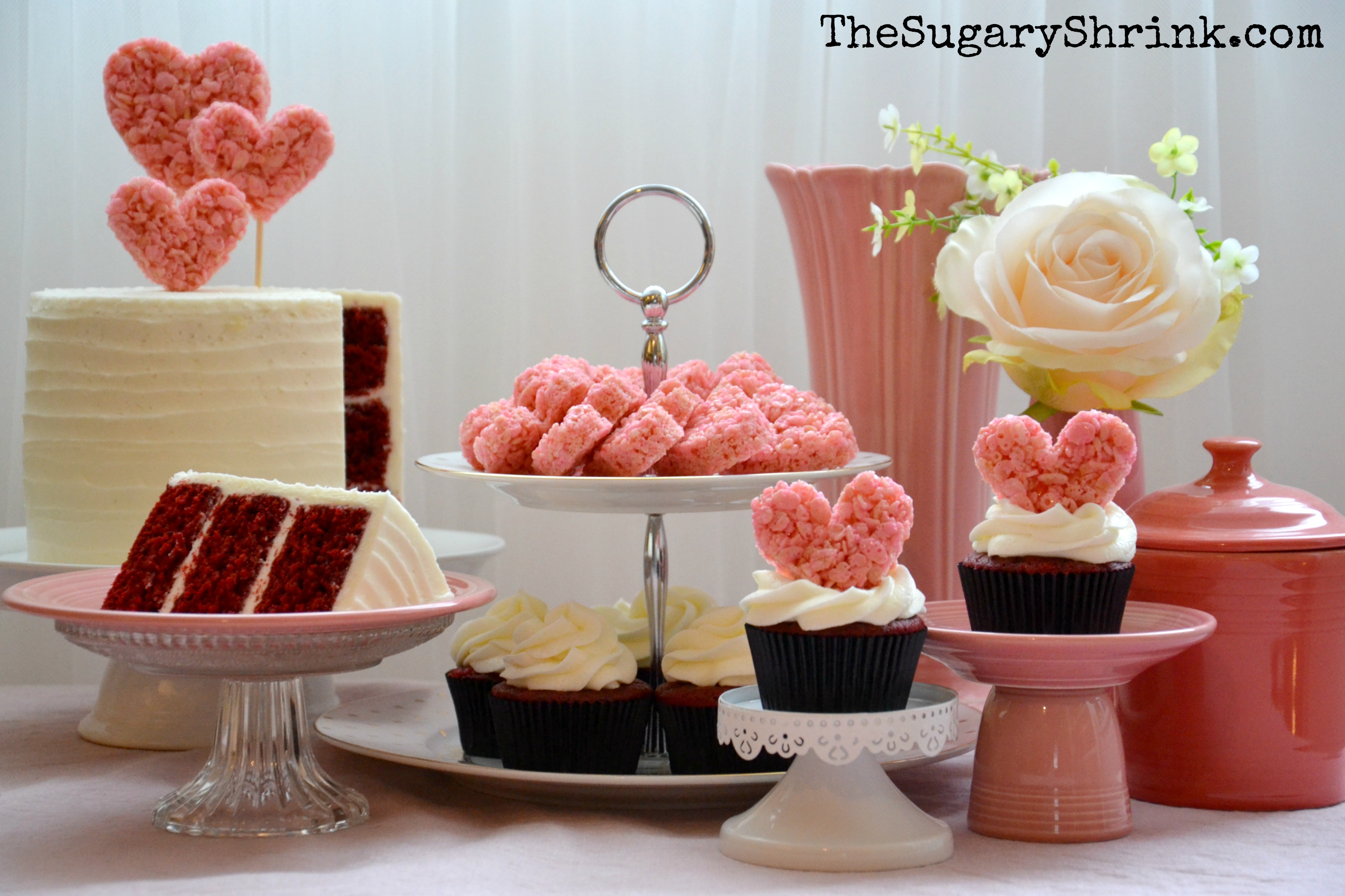 I don’t think it would be Valentine’s Day without a Red velvet layer cake covered with a lovely cream cheese buttercream. This triple-layer cake has a rustic design which pairs quite nicely with the whimsy of the pink Rice Krispie hearts.