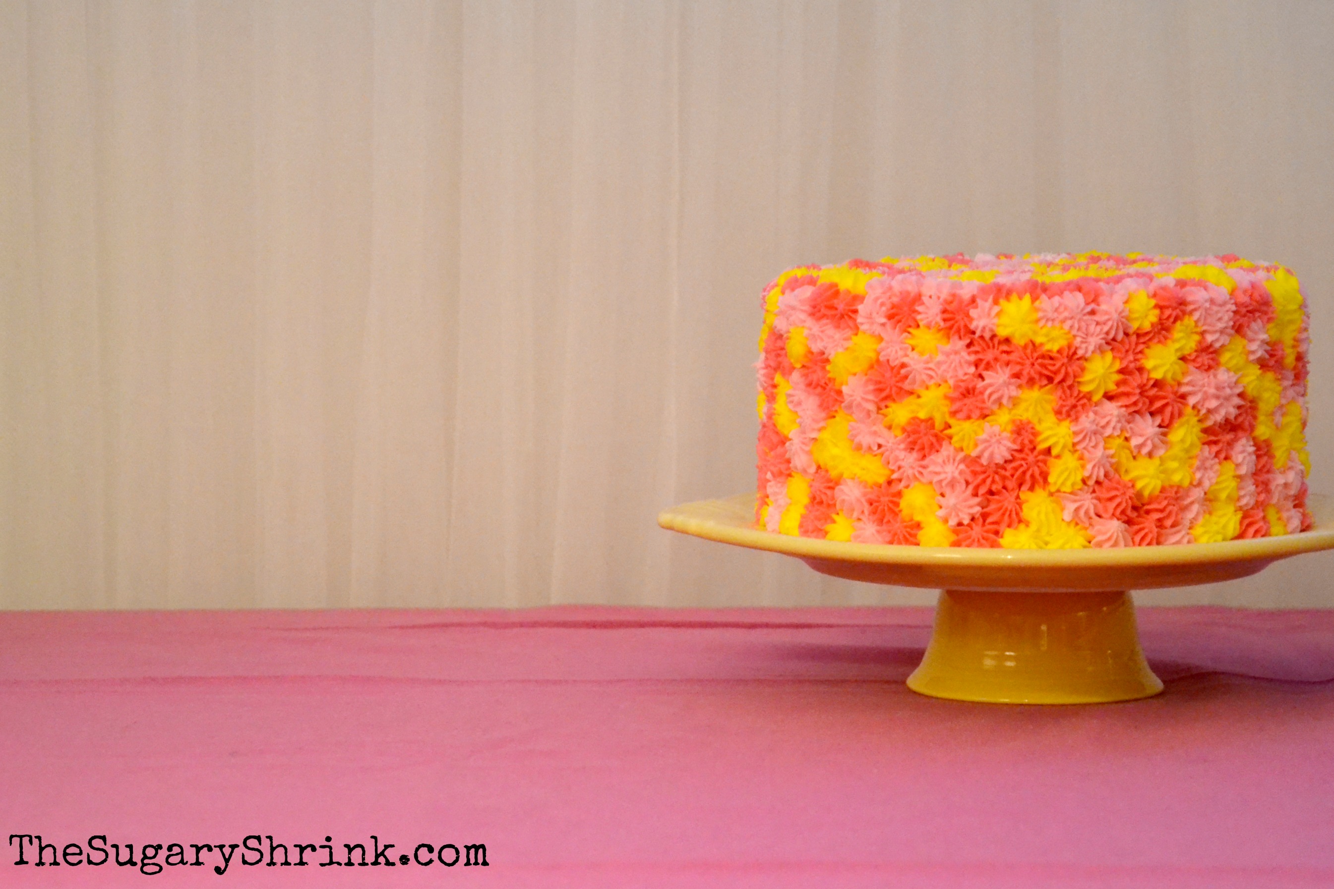 This particular design uses a small open-star tip (whatever you have at home is fine) with three different complimentary colors of lemon buttercream, but don’t be afraid to use four or five colors. Work in small areas then move on to the adjacent section. It is a very forgiving design and extremely approachable.