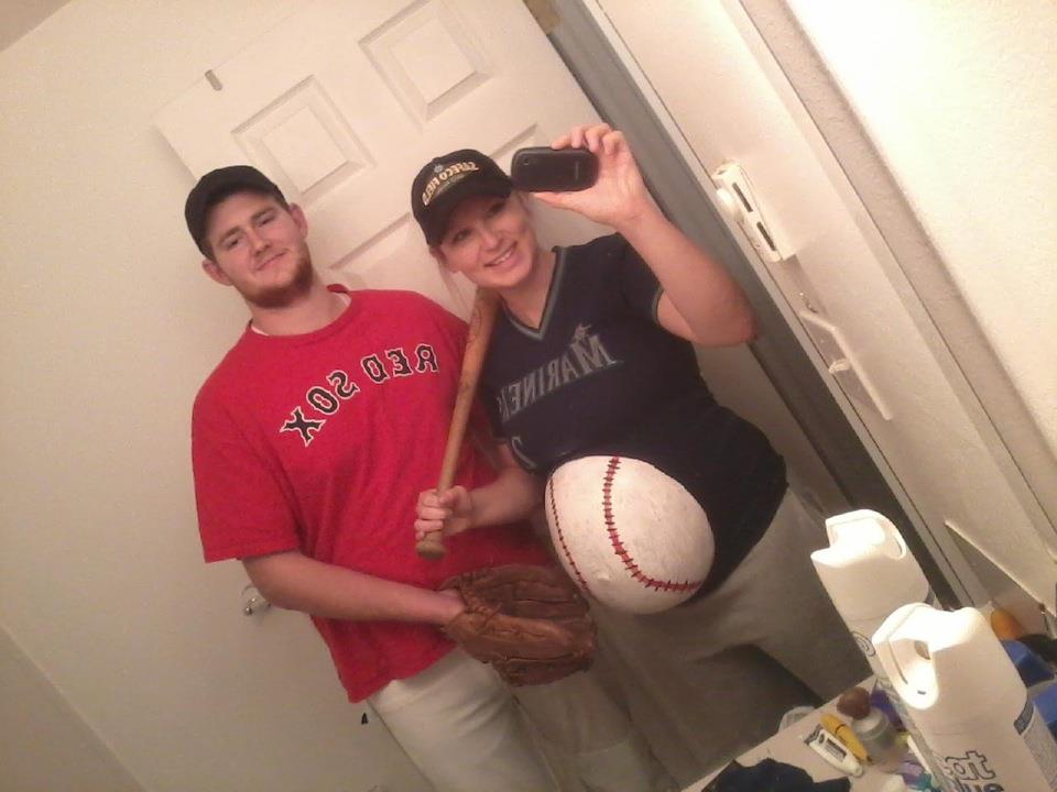 This adorable couple’s costume hits it out of the park! Make your bump the focal point by cutting a hole in a baseball shirt — then break out the body paint, white pants, bat and baseball glove to complete the look. Costume creator Nina said the glove is to catch the ball (their daughter).