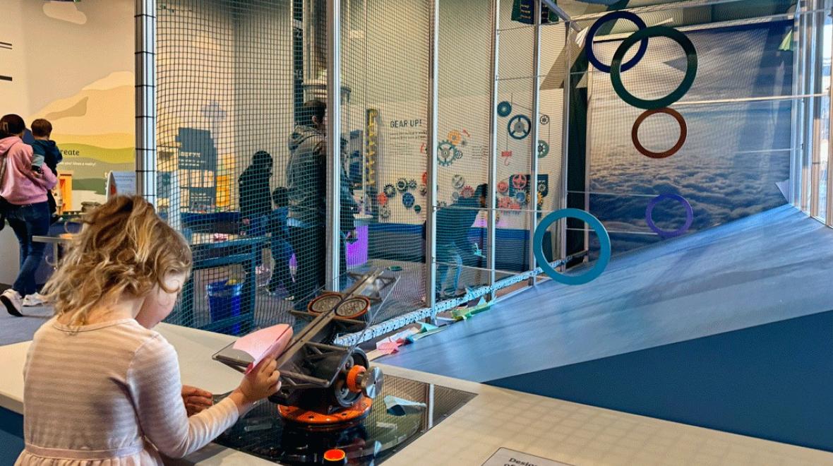 The Engineer It! Gallery expanded with the addition of “Ready… Set… Launch!” in December 2025. The interactive airplane launcher exhibit invites families to fold and test paper airplanes. Fortunately, there were plenty of materials available, as some attempts were more successful than others.