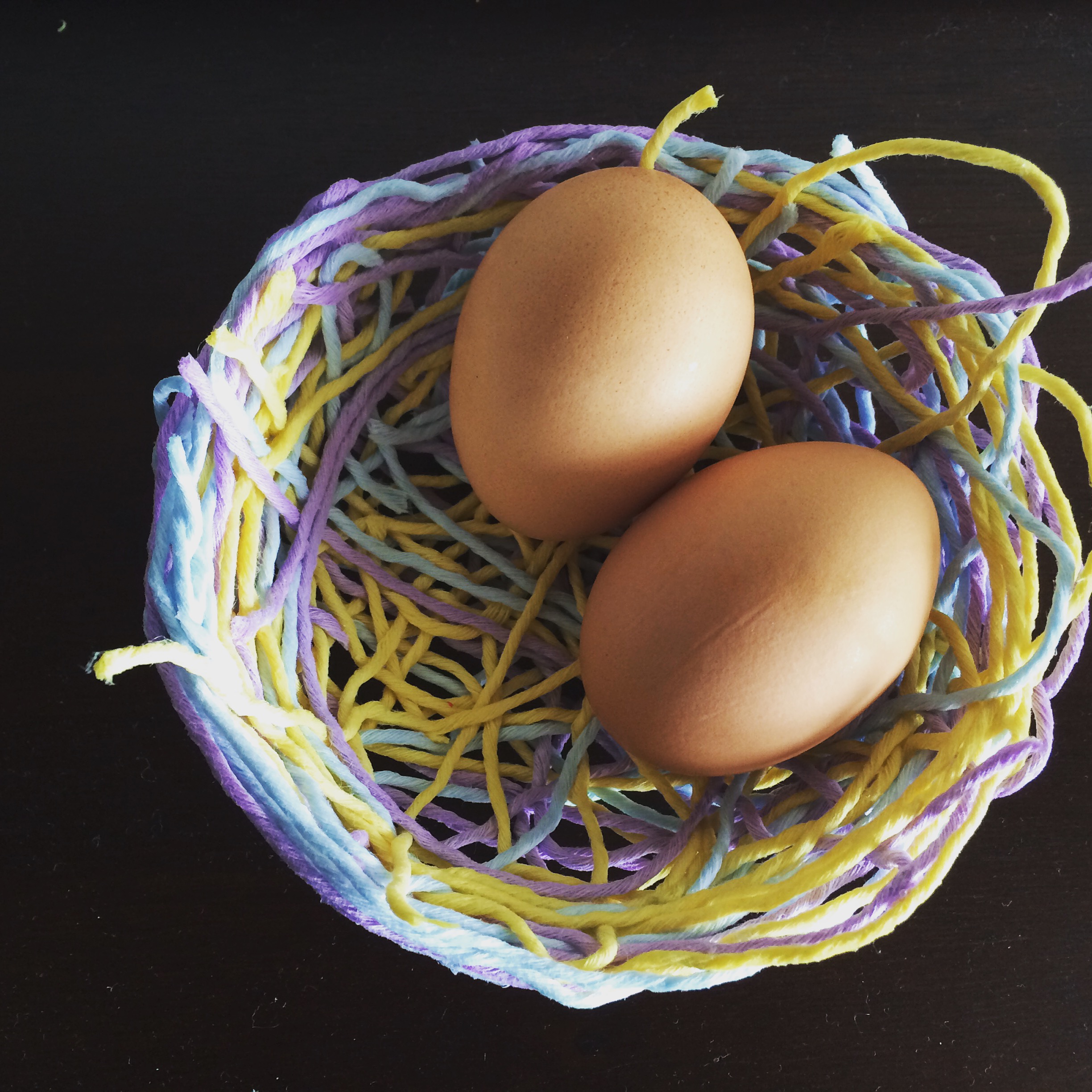 - With fingers or tongs grab one piece of yarn at a time and start building your birds nest on your plastic-wrap covered bowl. Place the pieces this way and that, wrap them, layer them and see what happens! If your little ones are hesitant to touch the glue and they’re still building up on those fine motor skills, clothespins are a great substitute for tongs.