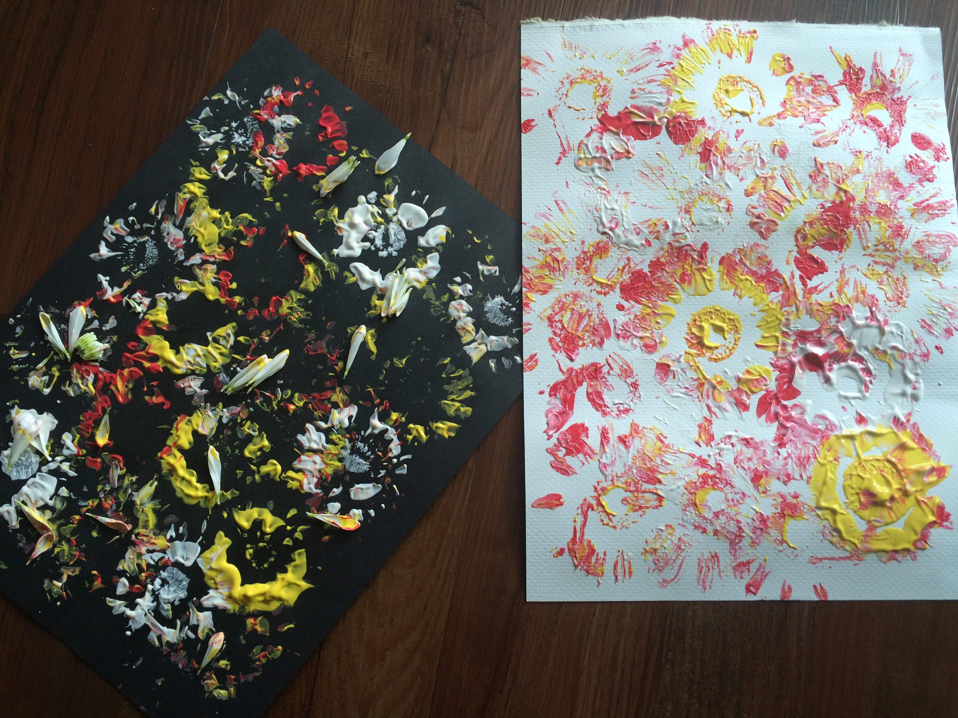 - Dip your flower heads into the paint and start creating! Try stamping, turning and moving the flowers in all different directions.