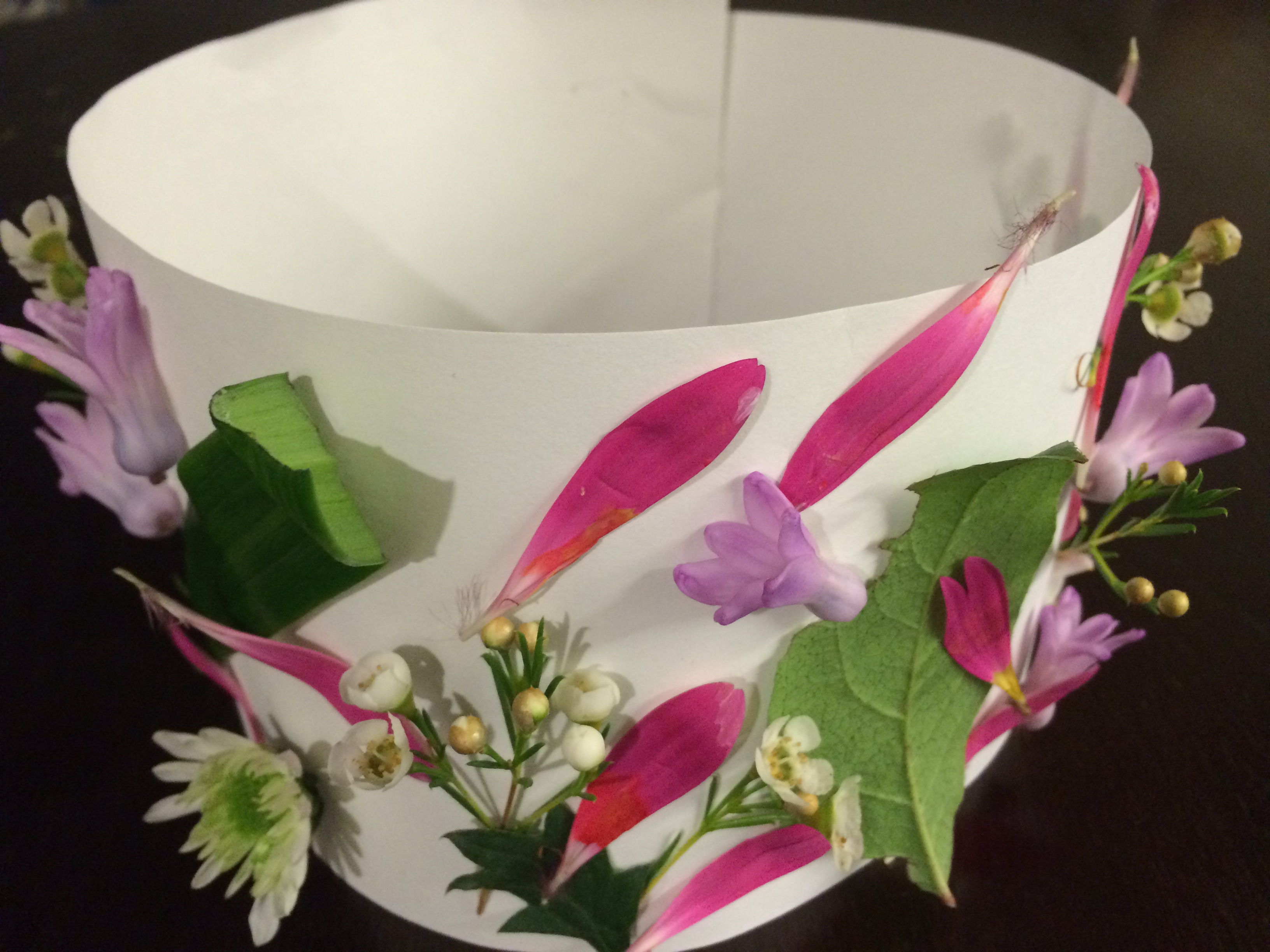 - Set out all of your nature treasures and get decorating! (Note: If you’re using glue, you’ll have to wait for the crown to dry before taping it around your child’s head. If you use the double-sided duct tape, there’s no dry time so have at it!)