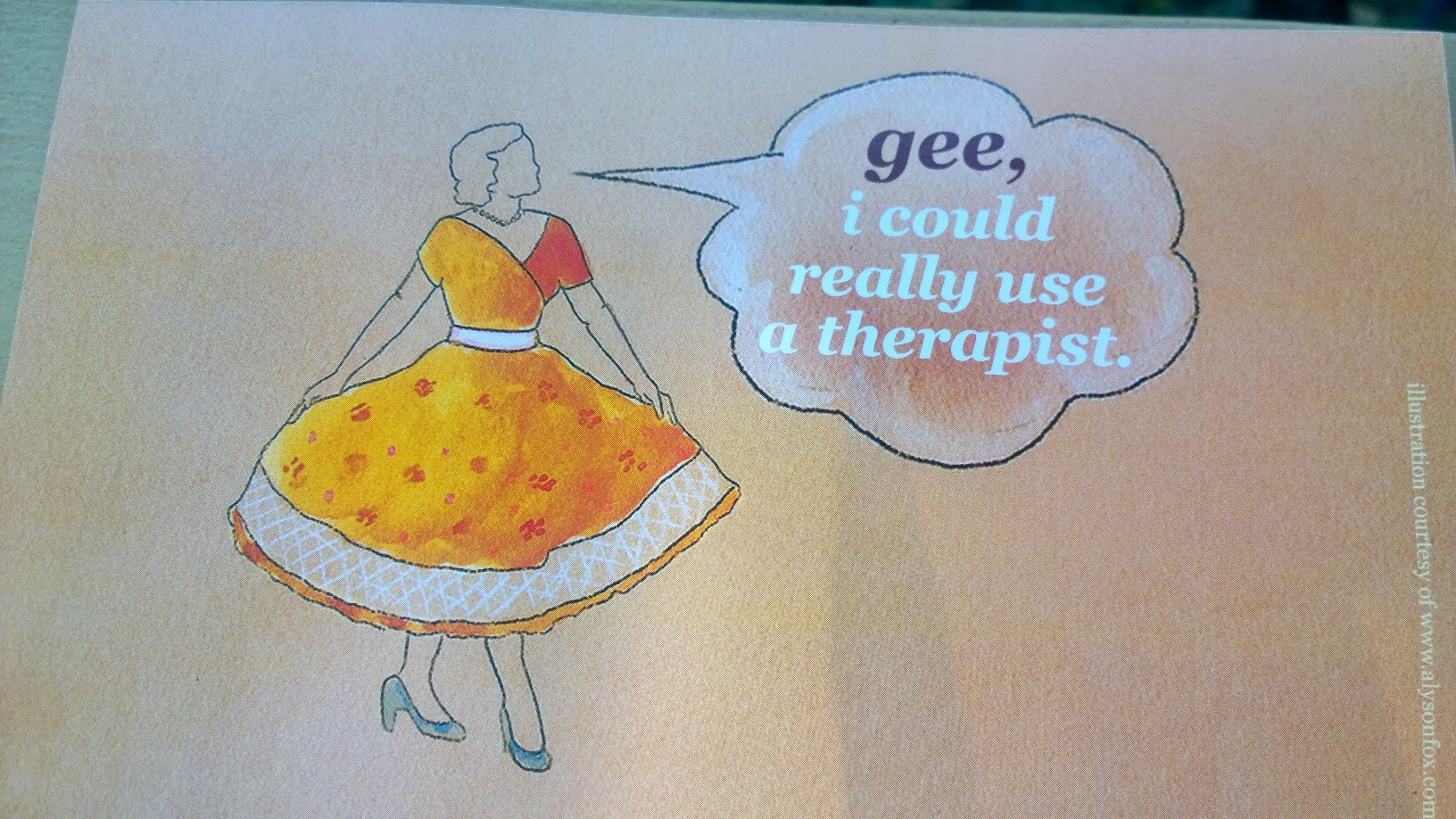 2. Everything that came in the mail today smacked of a certain irony, even schadenfreude. Email subject line #1: TIME OUT FOR MOM! Email subject line #2: A WONDERFUL TIME TO BE IN SEATTLE! And postcard that arrived in my mailbox (in shame-conferring lowercase script): gee, i could really use a therapist (courtesy of one Center for Psychology of Women).
