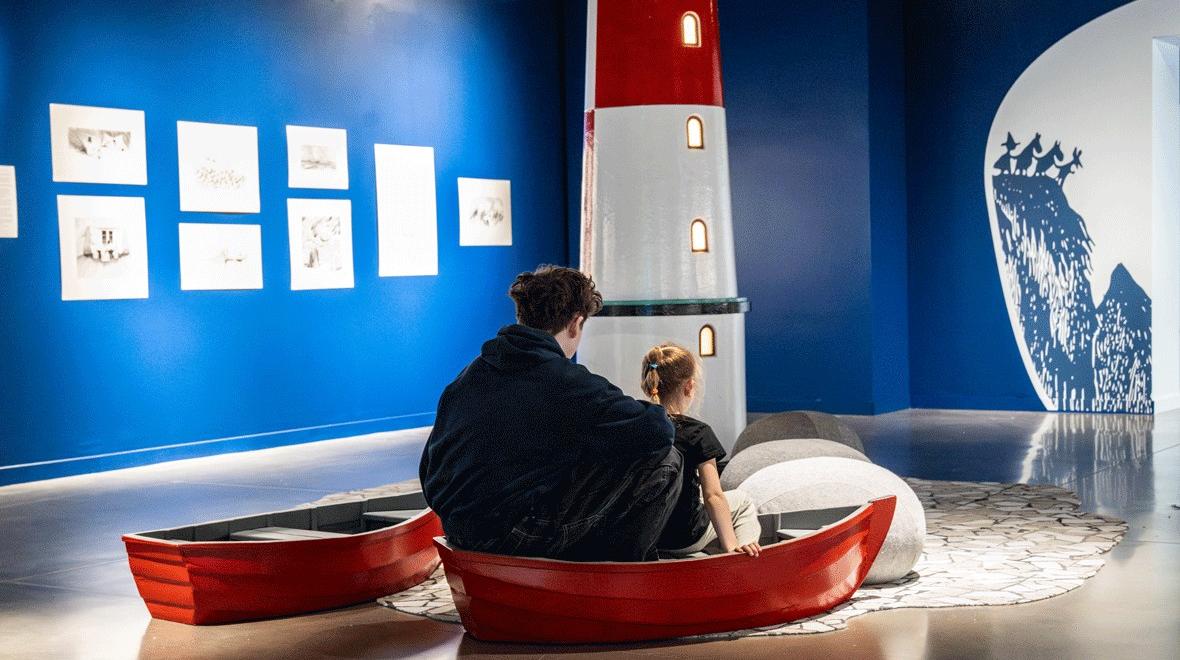 - “Moominpappa at Sea” (1965): The imagery of Moominpappa rowing in the vast sea, nearing a lighthouse and rocky island, is integral to the Moomin exhibition. Read the full story of Moominpappa’s desire for adventure and how the Moomins adjust to their new lives as lighthouse keepers.