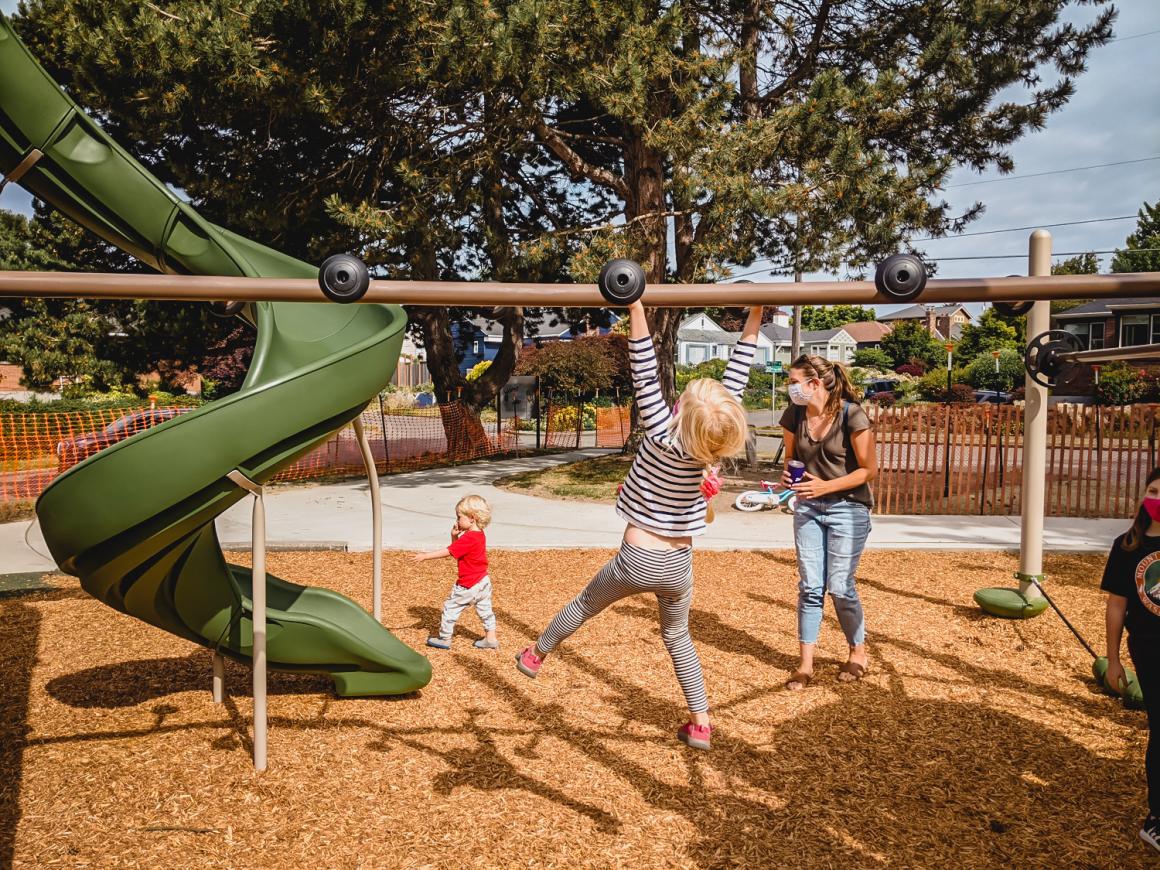While my kids are willing to endure a long car ride if we have a new playground destination, I appreciate a more local renovation from the deepest depths of my mom-shuttle heart. After eagerly watching the Seattle Parkways blog for months, I was ecstatic, as were my kids, when the new Loyal Heights Playfield play area finally opened earlier this month.