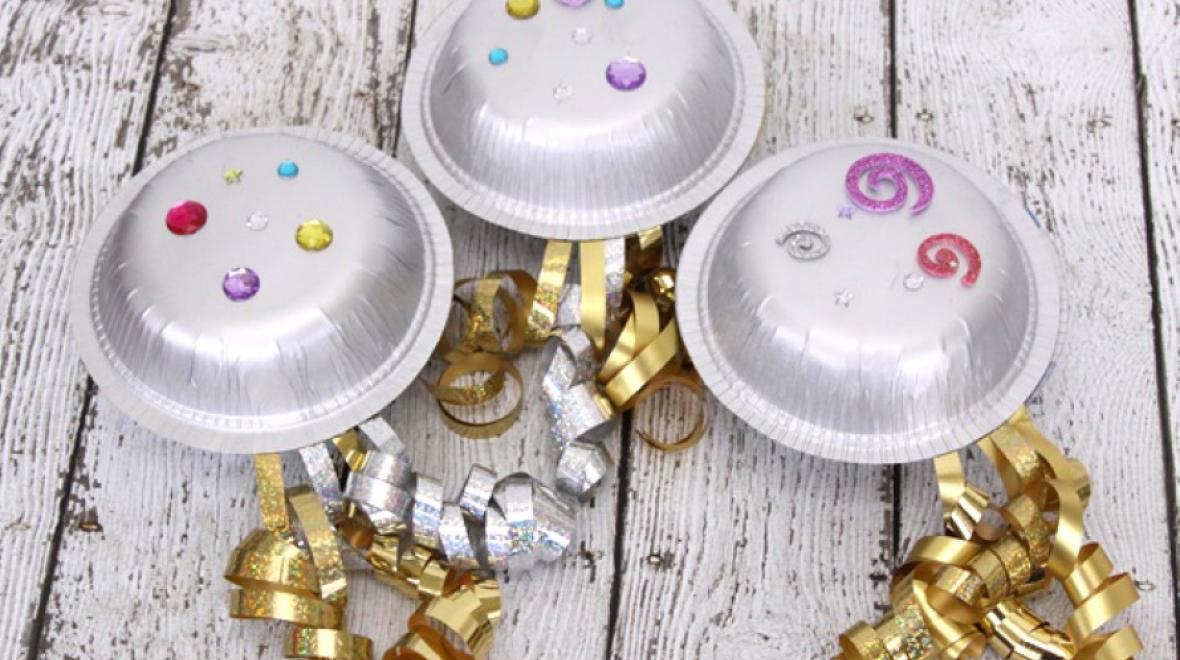 Create DIY noisemakers using objects from around the house. Decorate empty, lidded canisters such as butter containers, coffee cans, Pringles cans, etc., and add dried beans or rice to make shakers. Or try this crafty idea made with paper plates and candy from Momtastic.