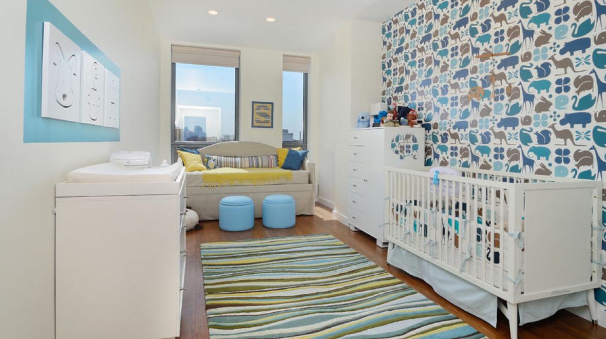 To start, here's a dreamy accent wall featuring jungle creatures in a blue and taupe jigsaw pattern from DwellStudio. When using a busy print like this, keep other walls and furnishings simple so the room doesn’t feel busy.