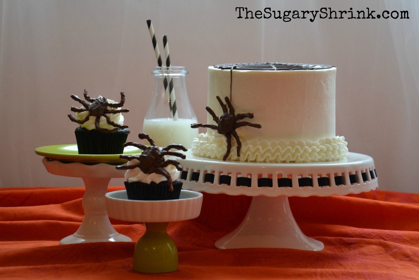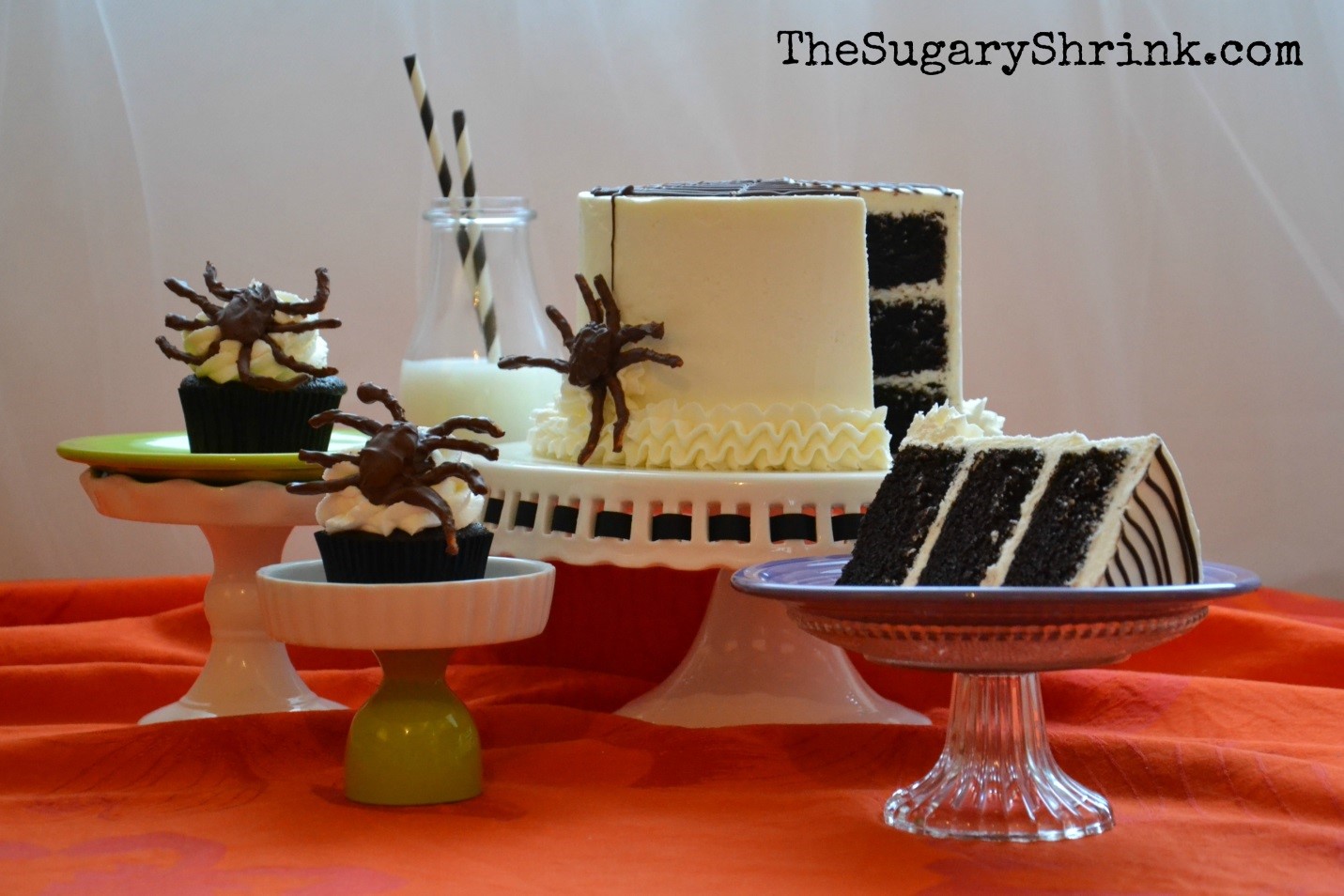 Bring on the scary! This is a basic, triple-layer chocolate cake with vanilla buttercream. The bottom border was piped on with my favorite Wilton 1M piping tip. The web on top of the cake was made when I melted some Nestle’s chocolate morsels, spooned it into a piping bag, and slowly (but not too slowly) piped a spiral of chocolate on top of the cake. I immediately ran the tip of a knife under hot water to warm it and ran it from the center of the cake to edge. The finished streaks gave it a web appearance and I didn’t have to worry about any of the evenness. It’s cake; I shouldn’t have to be anxious.