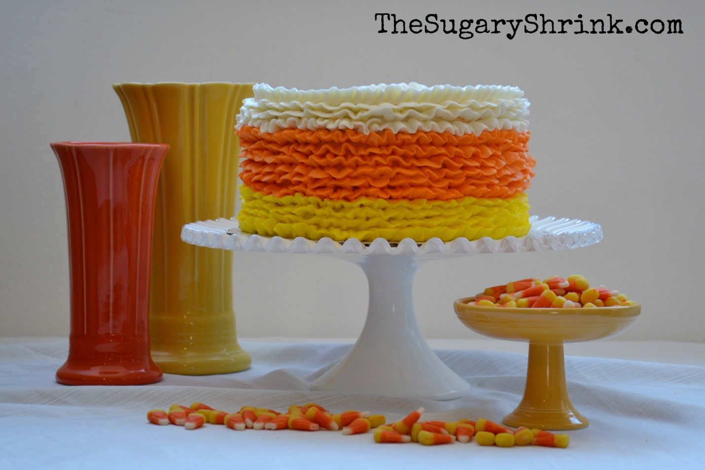 Ruffles that mimic the colors of candy corn are a show-stopper. I usually use a Wilton 104 tip and keep the wide end of the tip against the cake while slowly spinning the cake away from me. There are many different techniques to achieve this look; find something that works best for you.