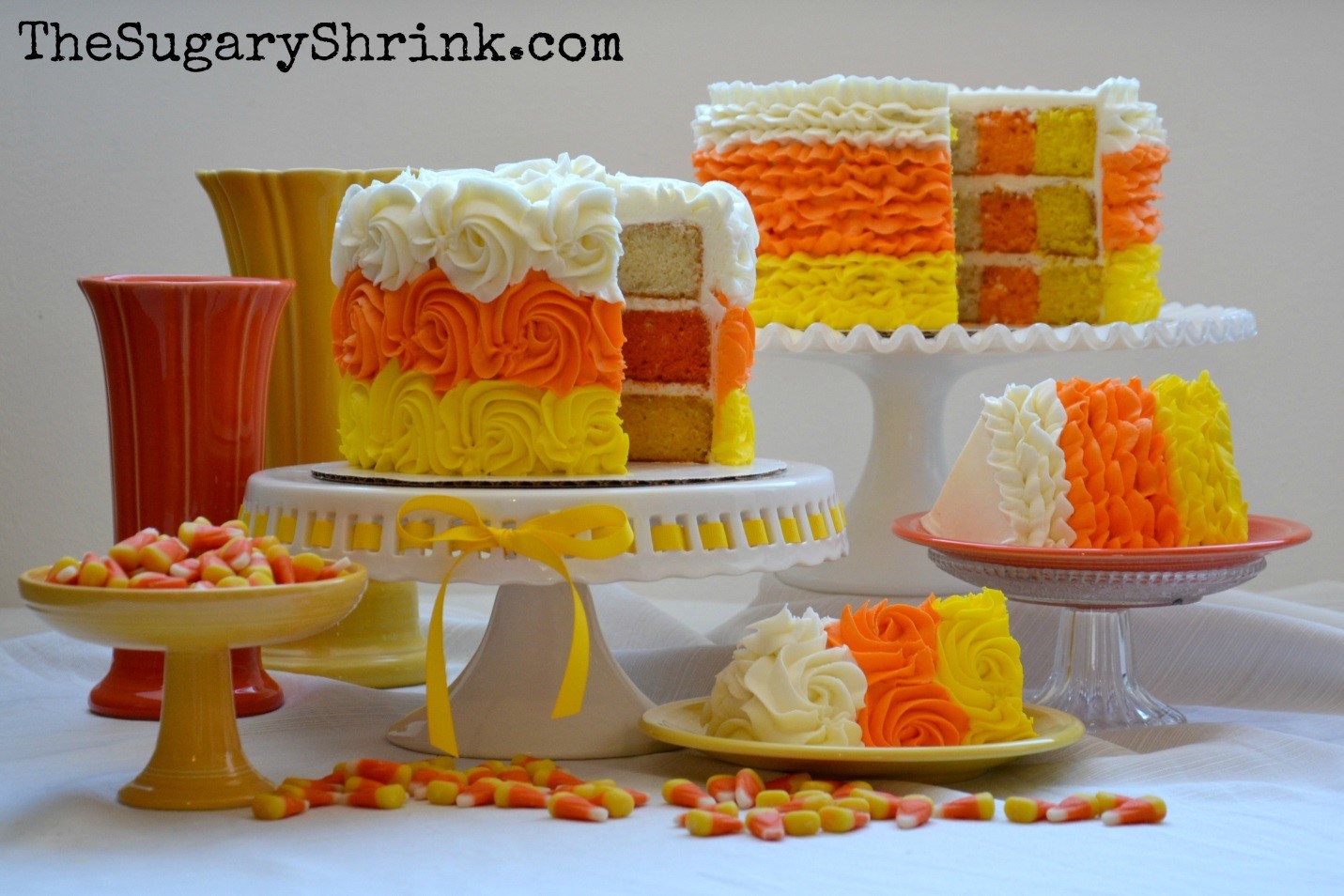 A triple-layer vanilla cake is a wonderful vehicle to introduce one of my all-time favorite Halloween treats: Brach’s Candy Corn. I don’t mind admitting I swapped out some of my siblings’ candy corn with something from my own Halloween loot because I’m such a fan. Also, I may not have mentioned it to them … until now.