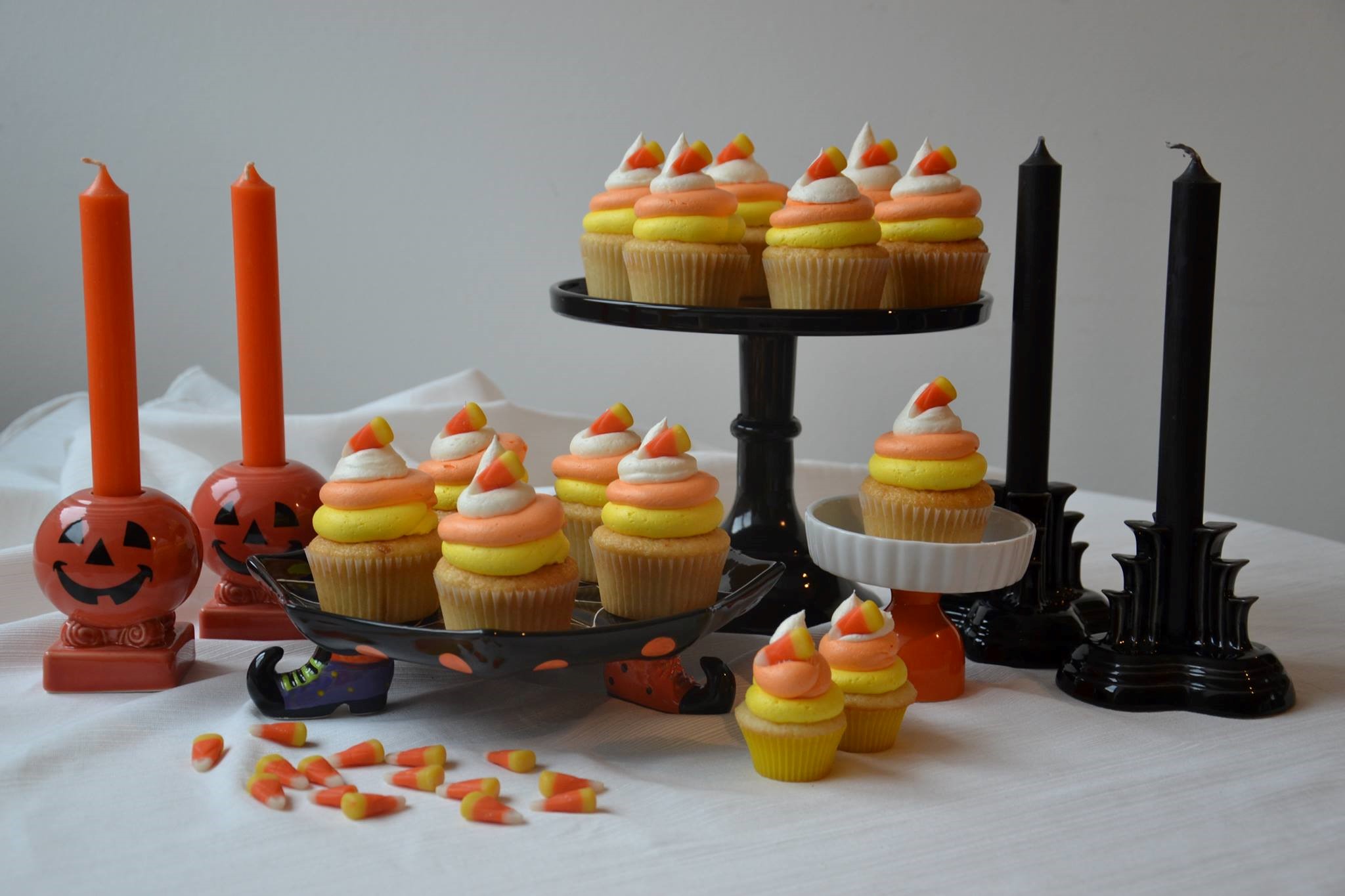 These are vanilla cupcakes and mini-cupcakes decorated to look like candy corn. I separated out the vanilla buttercream, but not evenly since I needed considerably more yellow than orange or white. Adding a piece of candy on top might not have been necessary, but I liked it — baker’s choice! This is a perfect treat for a neighborhood Halloween party, Scout meeting, or any event where you don't want to be bothered with slicing up a cake and handing out plates.