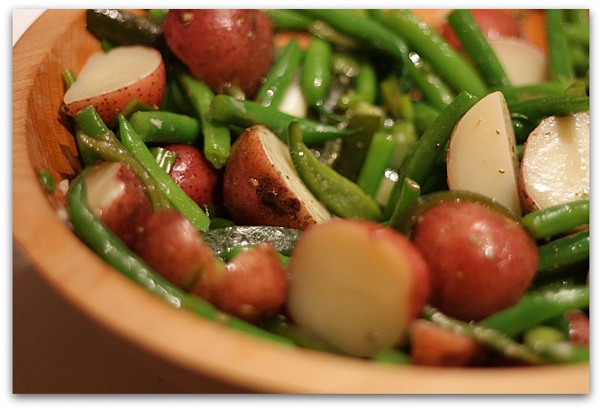 Place potatoes and green beans in a bowl and sprinkle with cider vinegar. Toss with remaining ingredients and taste for seasoning.