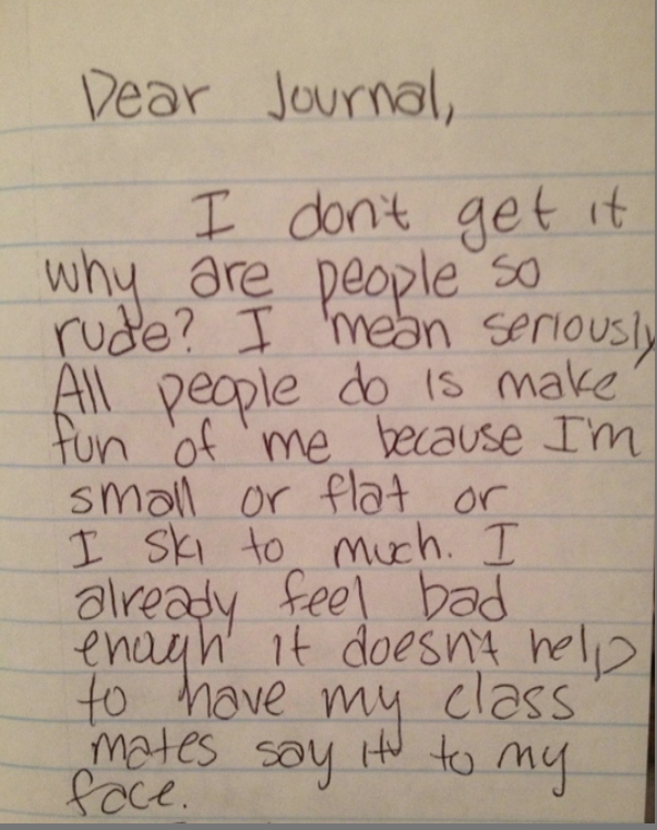 I don’t get it. Why are people so rude? I mean seriously. All people do is make fun of me because I’m small or flat or I ski to (sic) much. I already feel bad enough it doesn’t help to have my classmates say it to my face.