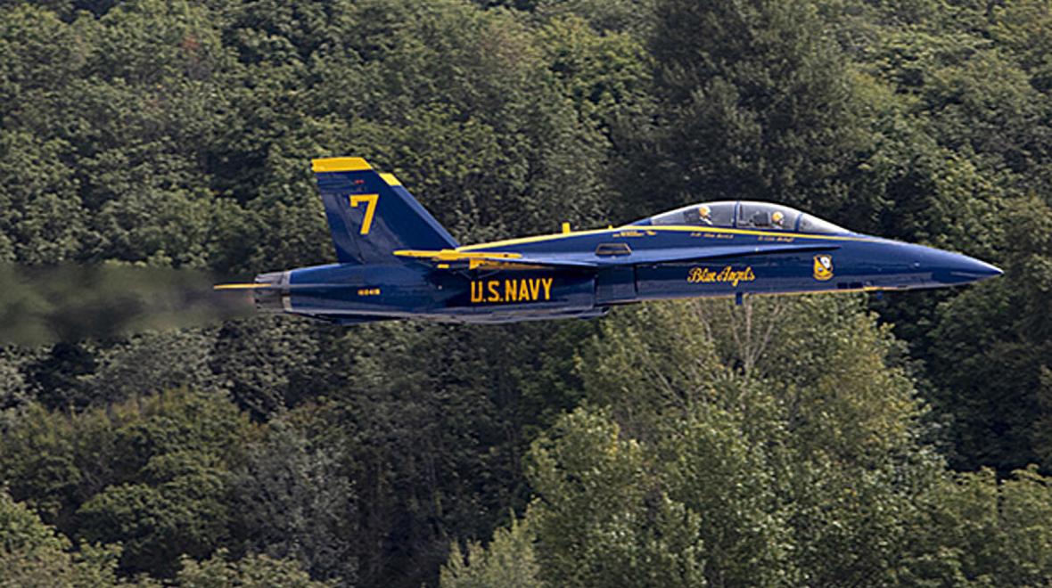 Image: Blue Angels F/A-18 Hornet taking off from Boeing Field in 2019. Ted Huetter/The Museum of Flight.