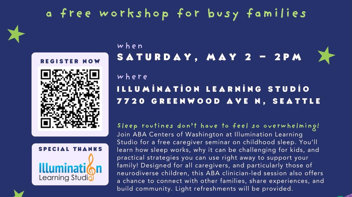Join ABA Centers of Washington at Illumination Learning Studio for a free caregiver seminar on childhood sleep. You’ll learn how sleep works, why it can be challenging for kids, and practical strategies you can use right away to support your family! Designed for all caregivers, and particularly those of neurodiverse children, this ABA clinician-led session also offers a chance to connect with other families, share experiences, and build community. Light refreshments will be provided.
