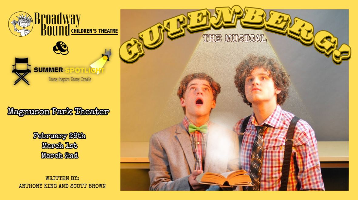 In this two-man musical spoof, a pair of aspiring playwrights Bud and Doug perform a backers’ audition for their new, ill-advised project – a big, splashy musical about printing press inventor Johann Gutenberg. With an unending supply of enthusiasm, Bud and Doug sing all the songs and play all the parts in their crass historical epic, with the hope that one of the producers in attendance will give them that elusive Broadway contract.