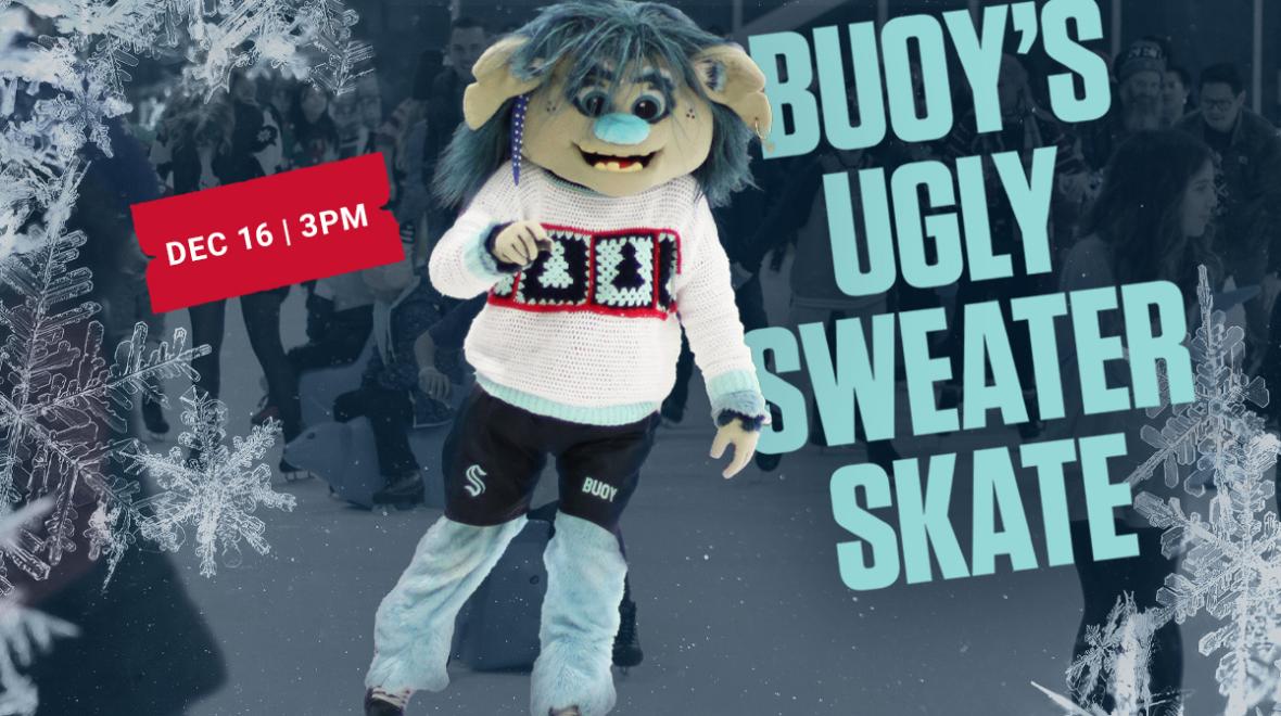 Ice skate at the official practice facility of the Seattle Kraken! Wear your ugliest holiday sweater to keep you warm around the rink. Everyone's favorite troll mascot, Buoy, will even make a special appearance!