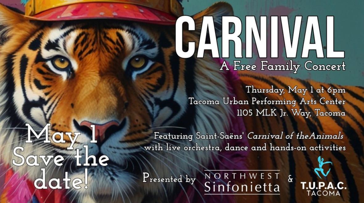 Join Northwest Sinfonietta and Tacoma Urban Performing Arts Center for a fun, family concert with live music, dance and interactive activities! Enjoy a performance of Saint-Saëns’ Carnival of the Animals and other favorites inspired by furry and feathered friends. This performance is offered free to our community.