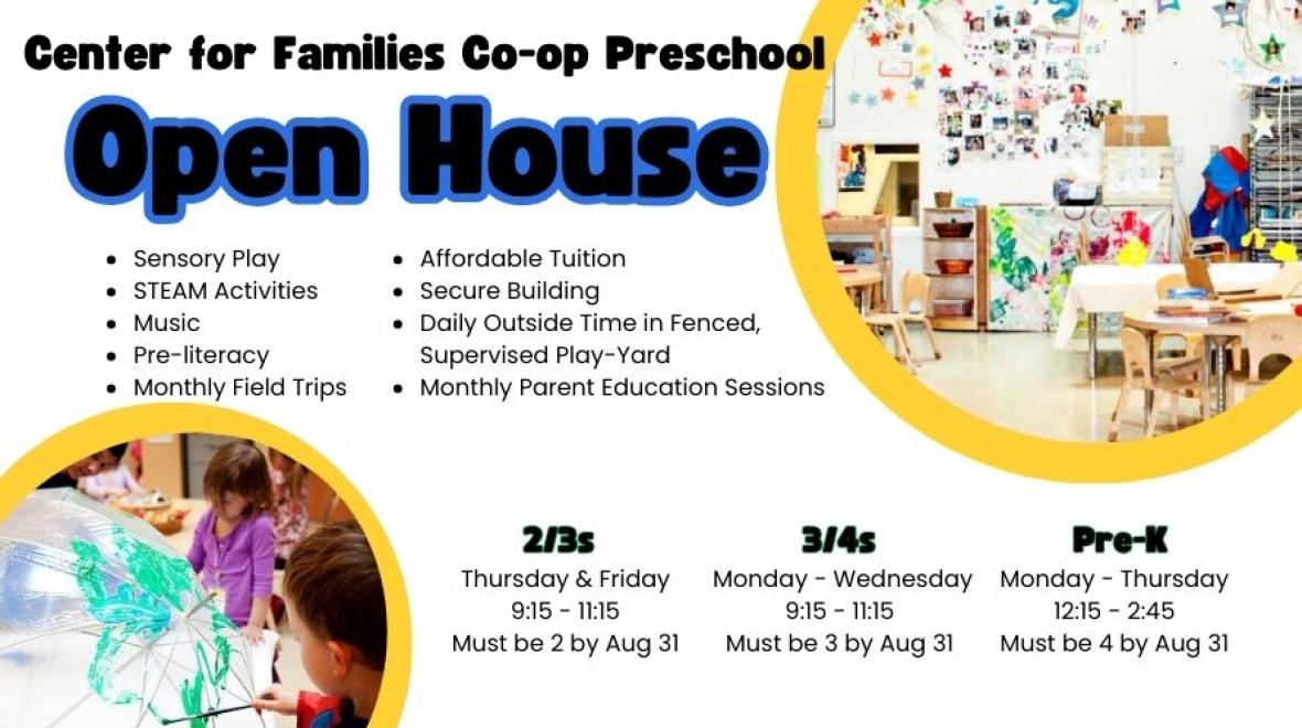 Join us at our open house to explore and play in our classroom, meet our teachers, and learn about co-op preschool! We offer 3 different classes for kids ages 2 - 5.