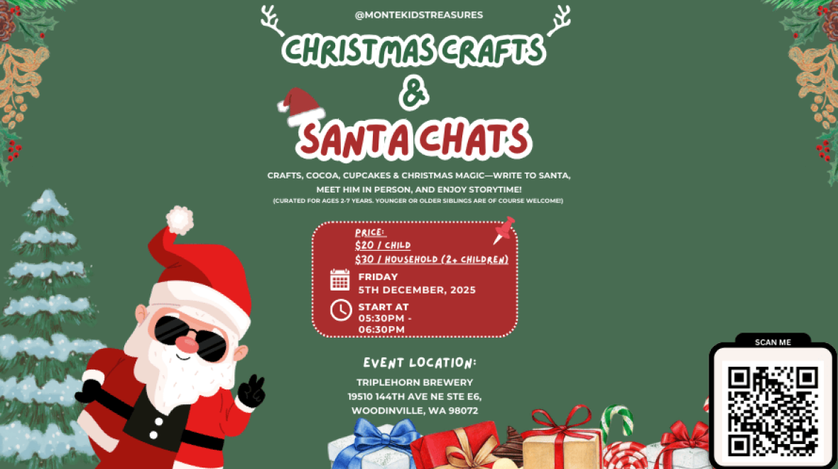 We’re excited to invite you to a magical holiday event for little ones — Christmas Crafts & Santa Chats, happening Friday, December 5th from 5:30–6:30 PM in Woodinville!