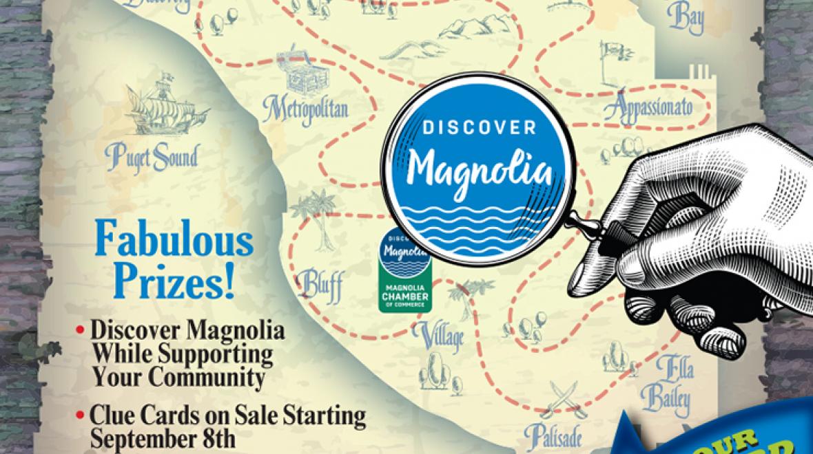Use clues to discover spots around Magnolia. Fill out the Clue Card with details you find at the spots and win fabulous prizes! September 8th-22nd. Price drawings will be at Metropolitan Market on September 22nd at 3PM. Clue cards are available at the Chamber booth at the Farmers Market (Saturdays 10-2), the Magnolia Garden Center, Metropolitian Market and Caffe Appassionato. Clue cards are $10 each.