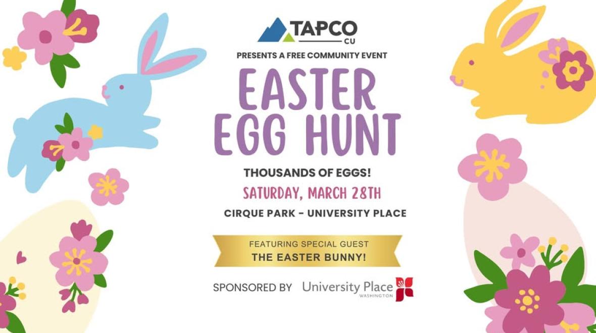 Join TAPCO Credit Union for a free Easter Egg Hunt on March 28th at Cirque Park in University Place. Thousands of eggs, free Easter Bunny photos, and family fun for all ages.