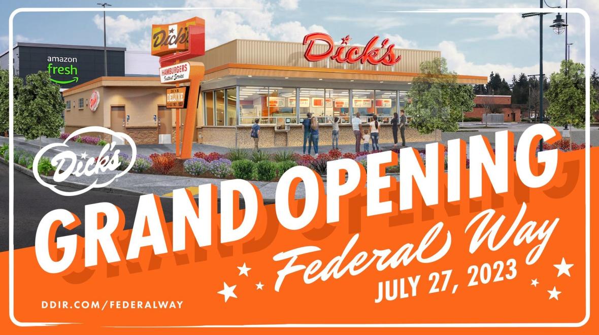 The celebration of the 9th Dick's Drive-In kicks off Thursday, July 27th at 10 AM! Be there on time to hear speeches from select Federal Way VIPs, including a few words from Drive-In President Jasmine Donovan, see our classic ribbon-cutting ceremony, and buy exclusive grand opening merch from our apparel pop-up shop!