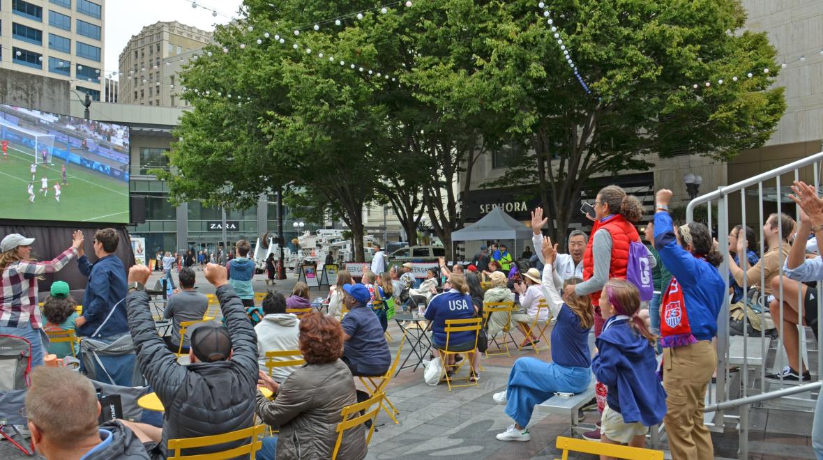 Show your fan spirit and cheer on your favorite soccer teams at free watch parties in the park! Watch parties will take place starting an hour before kickoff and feature themed giveaways, interactive activities, pop-up booths from community partners and food and drink for purchase. Catch every pass, save and kick on our big screen!