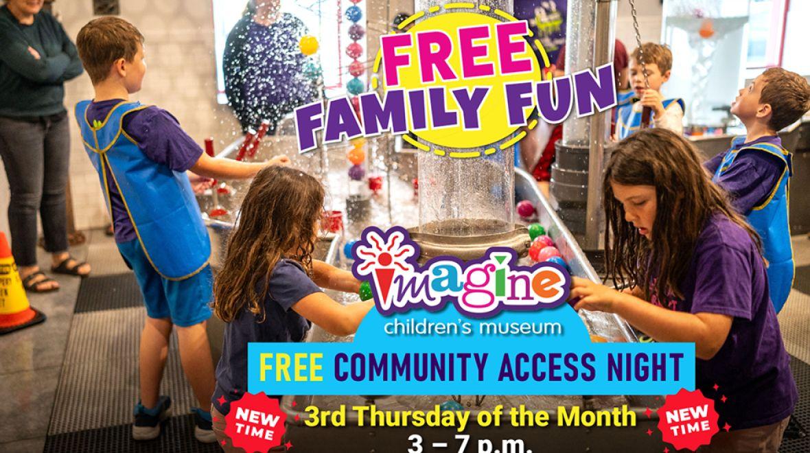 Community Access Night at Imagine Children's Museum offers families a free evening of fun every third Thursday of the month from 3 to 7 p.m. Enjoy hands-on, interactive exhibits designed to inspire playful learning and discovery for all!