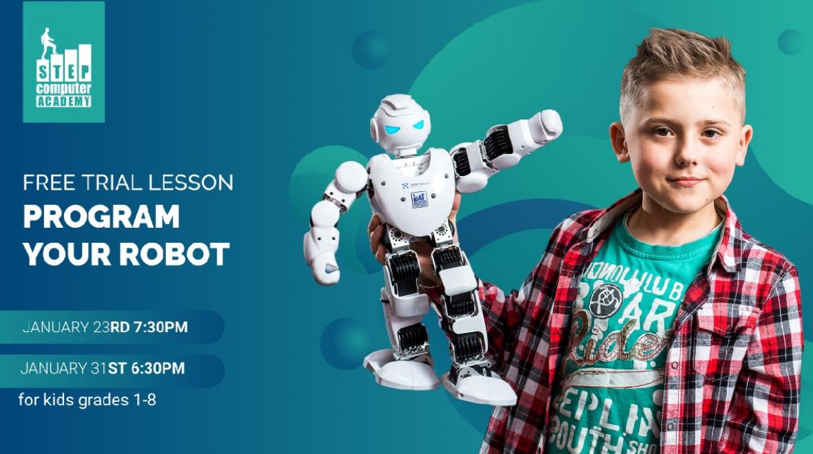 FREE trial lesson for kids grades 1-8 (we’ll divide kids into groups based on their grade). Session focus: robotics, getting familiar with programming robots.